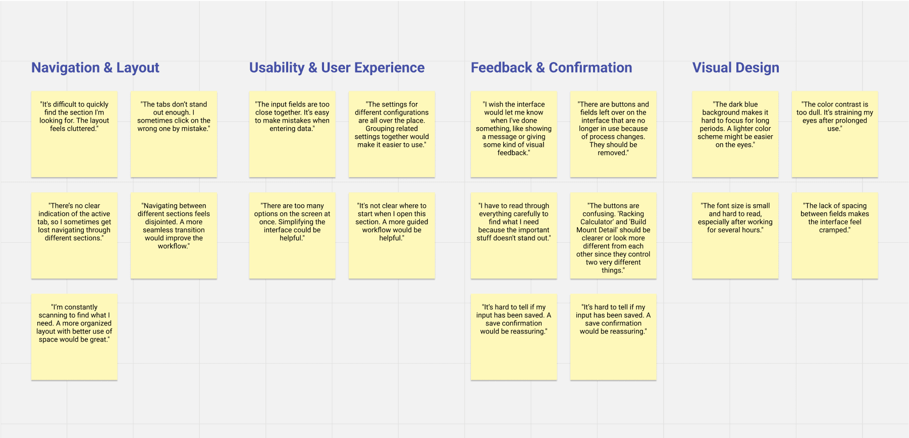 While at Sungevity, I actively gathered user feedback through continuous communication, using channels like chat, email, and in-person discussions. Archives of this qualitative data I saved were analyzed and organized using affinity mapping to pinpoint key pain points and prioritize areas for improvement.